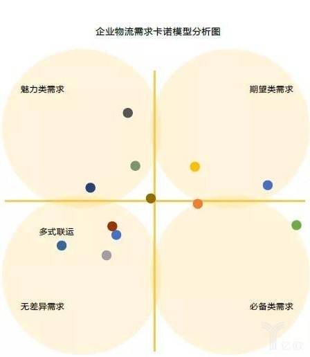 第一,貨主企業(yè)對多式聯(lián)運的需求不強烈。雖然近年來國家相關(guān)部門頒布了多項政策,大力推動多式聯(lián)運發(fā)展,但是據(jù)調(diào)研的數(shù)據(jù)顯示(如圖所示),多式聯(lián)運被貨主企業(yè)視為無差異類需求,即無論提供或不提供此服務(wù),貨主企業(yè)的滿意度都不會改變,貨主企業(yè)不在意此類服務(wù);貨主企業(yè)更在意的仍是成本控制、效率保障、響應(yīng)速度、貨損水平等因素。因此,國家政策鼓勵與支持,更多影響的是國有企業(yè)的運輸操作模式,而大量非國有企業(yè)因?qū)Χ嗍铰?lián)運的忽視,會使之缺乏長期發(fā)展動力,一旦國家政策的支持力度減弱,多式聯(lián)運將很有可能陷入慘淡經(jīng)營的境地。